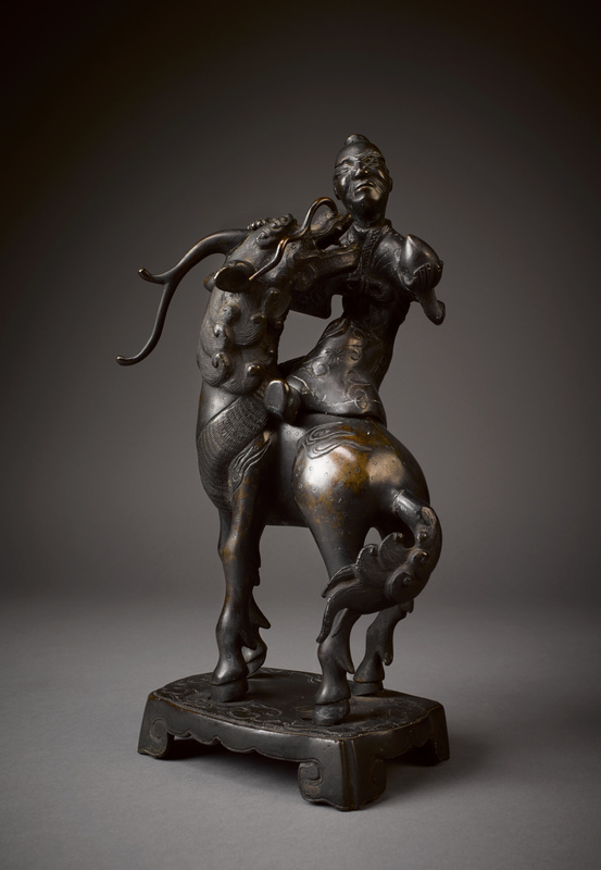 A rider sits astride a qilin, a mythical beast that is part dragon, part deer. The beast's mane is curled in waves; it lifts its muzzle towards the rider. The rider is holding an object in one hand -- perhaps a peach or a jewel. Flames and spotted markings are engraved on the beast.